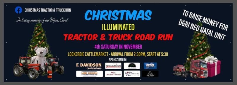 The annual illuminated Christmas Tractor and Truck Run will be Saturday the 22nd November. Vechicles start to arrive at Lockerbie Cattle Market at 2.30pm (£20 donation, cash preferred), there will be food trucks and toilets at Lockerbie along with a stall and raffle. The vehicles will be in their finest Christmas decorations and ready to leave Lockerbie at 5.30, making their way down through Lochmaben, along Annan Road to the Whitesands and then back up back Dalscone, St Anns and Johnstonebridge to head back to end the run at Lockebie Cattle Market. This is an annual event, last year there was approximately 280 vehicles passing by, please give us a wave and cheer!. We are raising funds for the Neonatal Unit at DGRI – if you can, please donate through our Just Giving Page – ” Light Up The Night For DGRINeonatal”