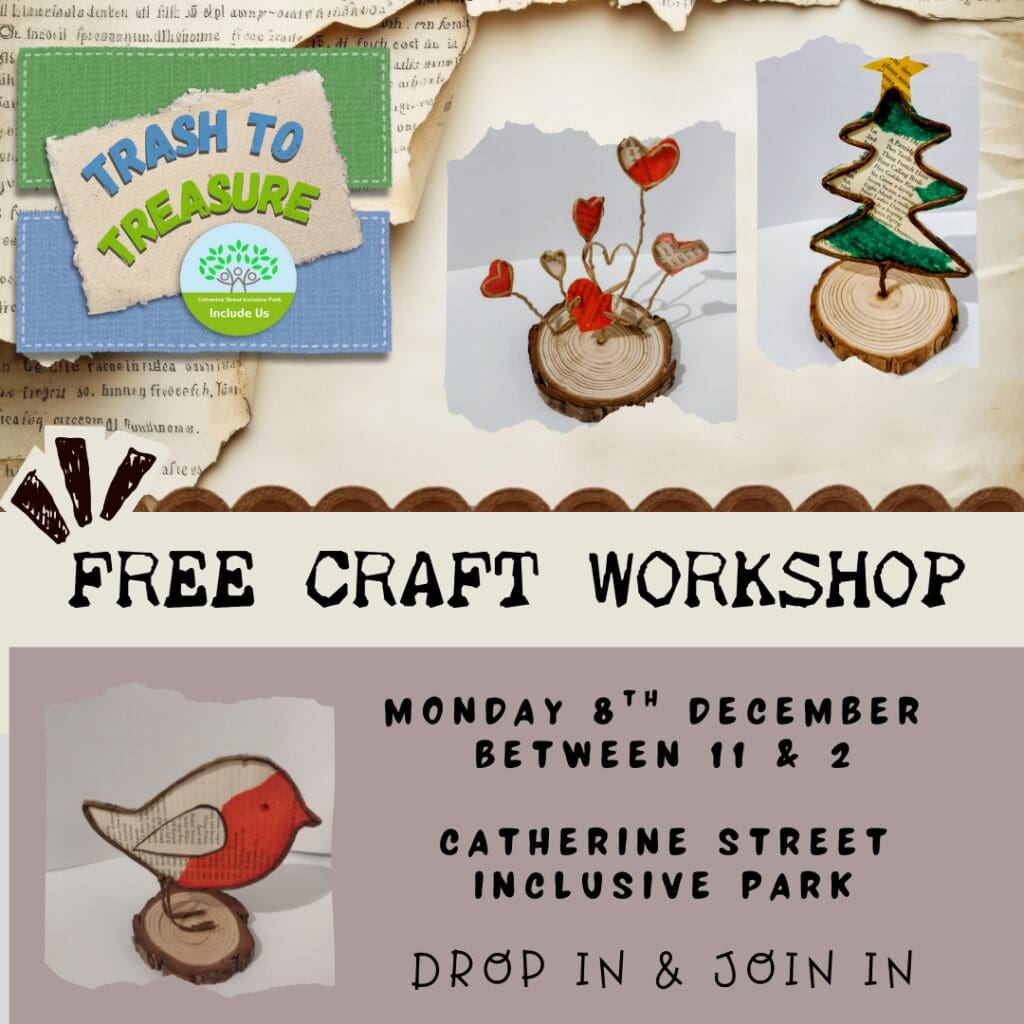 Drop in to Catherine Street Inclusive Park on Monday 8th December between 11 and 2 and enjoy some ‘me time’ upcycling old paper into fab decorative items. Please note this workshop is aimed at adults and young people but younger children are welcome to help parents/carers. We have some craft resources to keep them occupied.