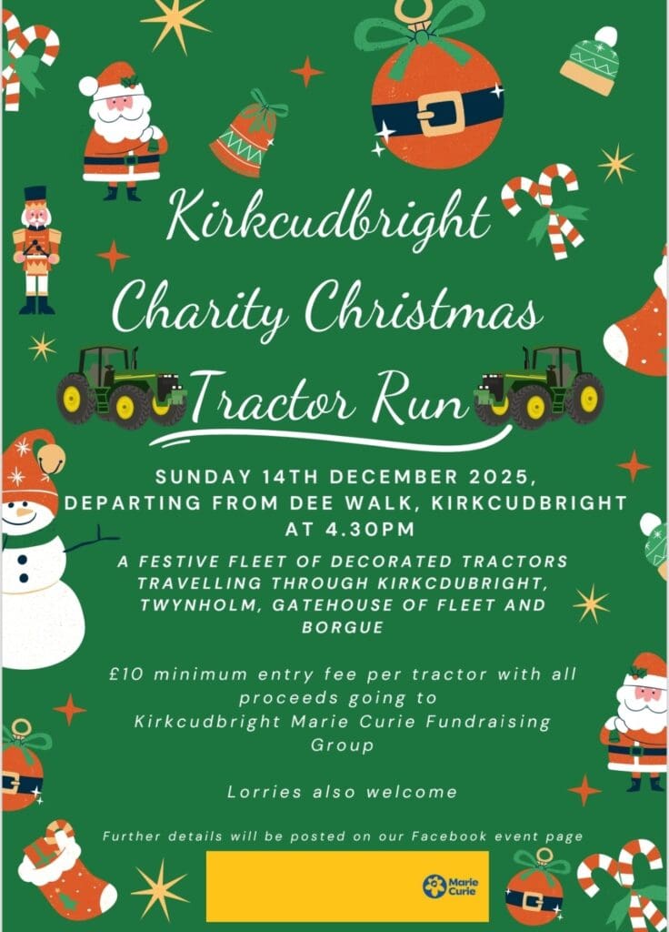 A festive fleet of decorated tractors, lorries and vans leaving Dee Walk, Kirkcudbright at 4.30pm on Sunday 14th December and travelling through Twynholm, Gatehouse and Borgue before returning to Kirkcudbright.