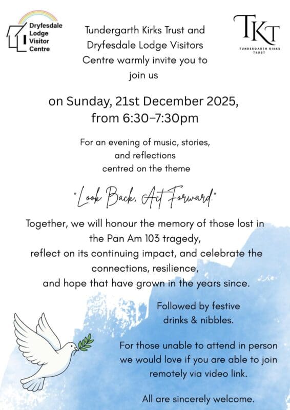 Tundergarth Church Langholm Road, LockerbieWe’re delighted to invite you to our special service of remembrance, at Tundergarth Church, on 21st December in collaboration with Dryfesdale Lodge Visitor Centre 🕊️🕊️ We will have uplifting performances from local singer Emma Cloy and a group of Lockerbie Academy students 🫶🏼 Friend of the Trust, Callum Watson, will also be playing his mellow […]